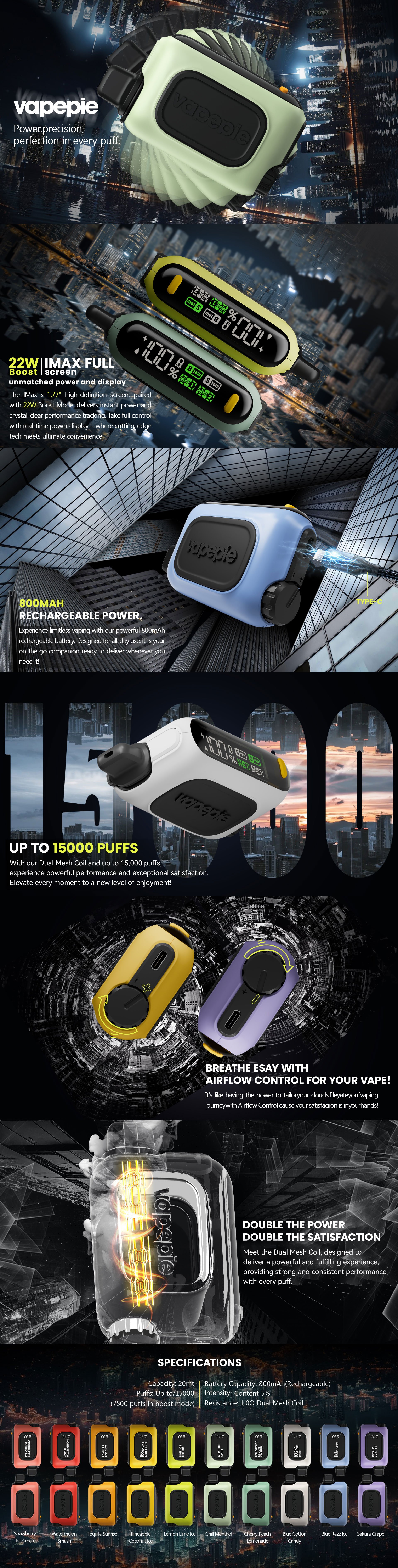 VAPEPIE RO 15000 Puffs – Small, lightweight, and ready-to-go with 20 mL capacity, 15,000 puffs, 5% intensity, dual-mesh performance, and 22W IMAX FULL Boost display.